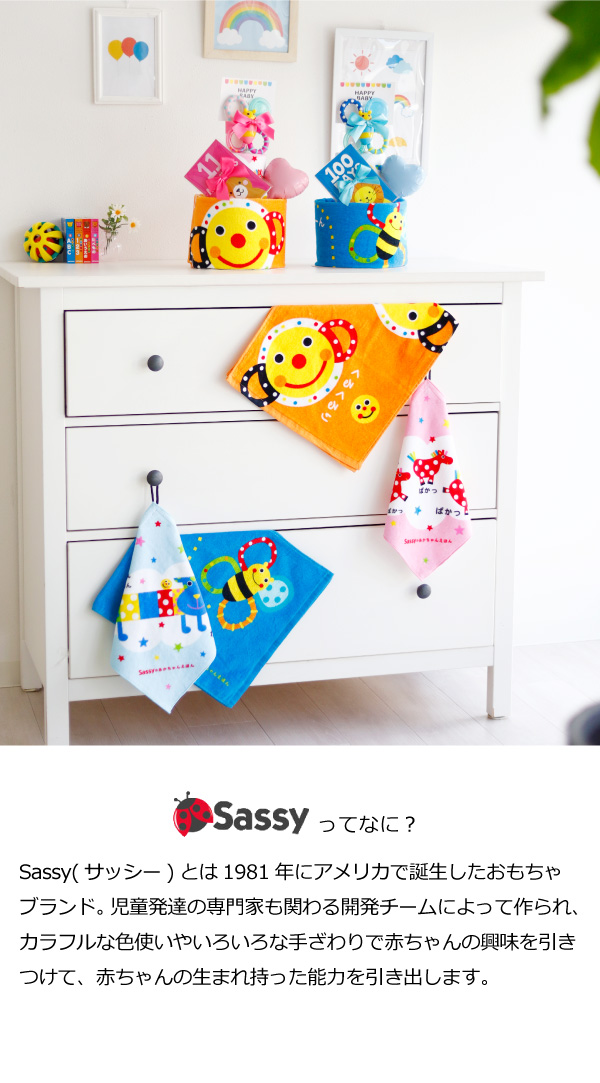児童発達の専門家も関わる開発チームによって作られたSassy(サッシー)の商品を採用。カラフルな色が特徴のSassyの商品は、赤ちゃんも興味津々!