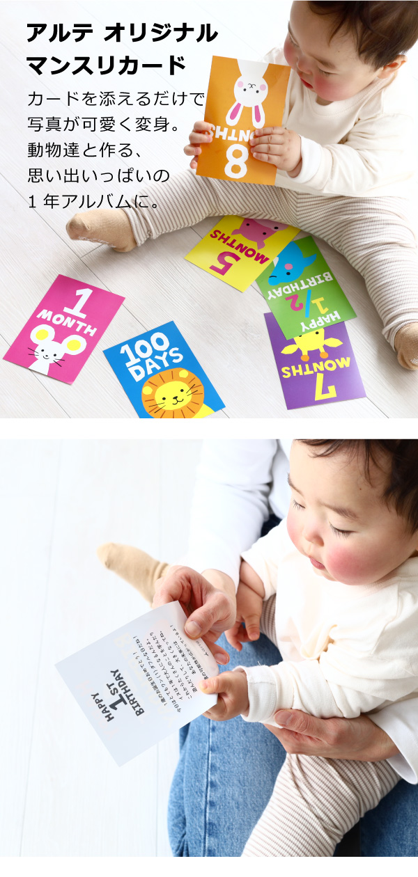 カラフルな動物が可愛いベビーアルテオリジナルマンスリーカード付いていて、カードの裏にはママから赤ちゃんへのメッセージを記載。撮影でけではなく、メッセージの読み聞かせでママとの愛情を深めることもできちゃいます。