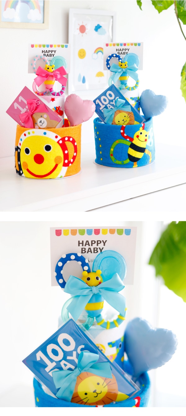 カラフルカラーで育児を応援!お部屋も華やぐおむつケーキです。