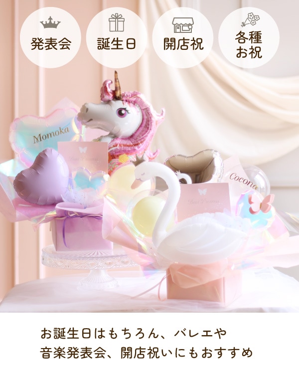 全4種類のデザインから選べる「ゆめかわバルーン」は、お誕生日はもちろん、バレエや音楽の発表会、開店祝いなど、