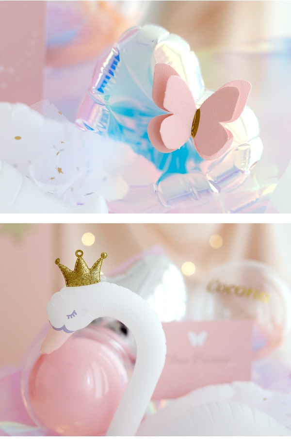 ひらひらと舞う蝶とや、きらめくオーロラバルーン!そして存在感たっぷりのユニコーンやスワンの大きなバルーンが