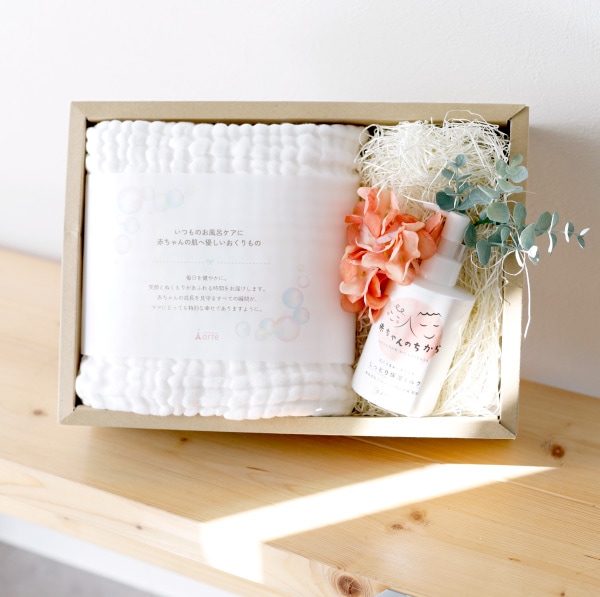 お風呂上りに楽しいスキンケアタイムを楽しんでいただける、ママもベビーも笑顔になるギフトセット。
