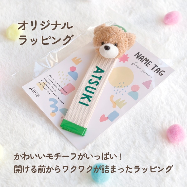 かわいいクマちゃんのアクセサリーが目を引くネームタグ。