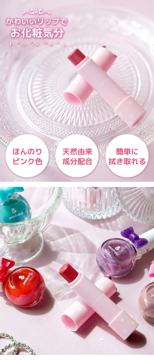 塗るとほんのりピンク色に色づく可愛いリップカラースティックです。 色素沈着の心配もなく、ウェットティッシュなどで簡単に拭き取りできます。