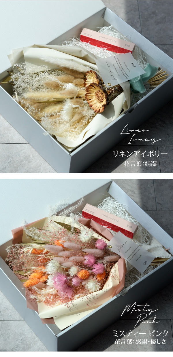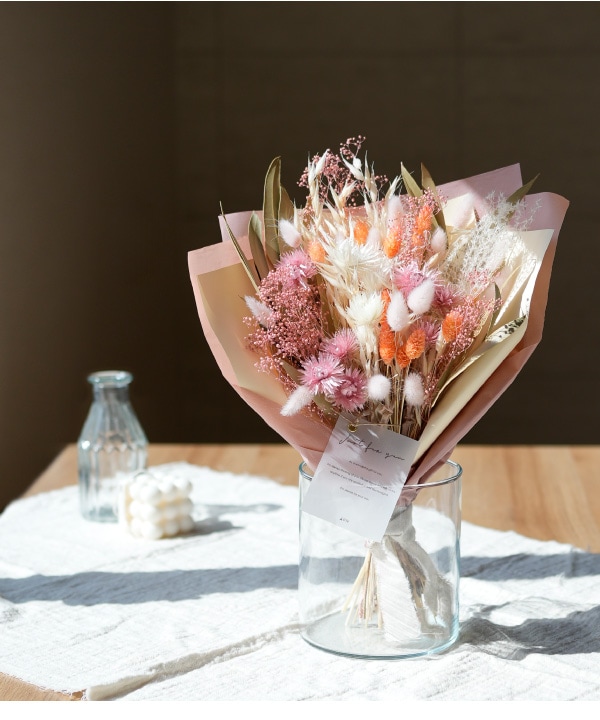 ドライフラワーの自然な風合いと、プリザーブドフラワーの鮮やかな色合いを長く楽しめます。