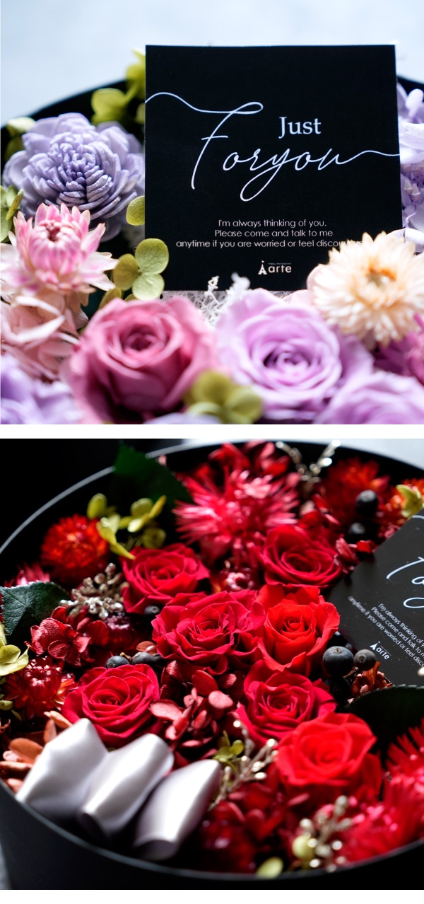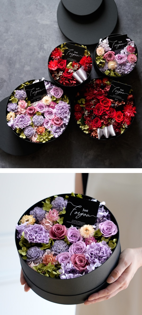プリザーブドフラワーをふんだんに使用した、洗練されたアレンジボックス。