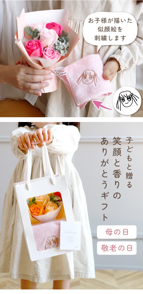 お手入れ不要で美しさが長持ちするソープフラワーと、お子さまが描いた似顔絵を刺繍したオリジナルハンカチを