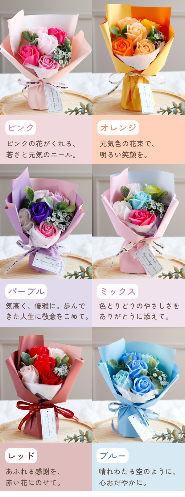 お花の色は、贈る方の雰囲気やお好みに合わせて選べるラインナップをご用意。見た目も気持ちも華やぐアレンジで、離れて暮らすご両親にも笑顔を届けます。